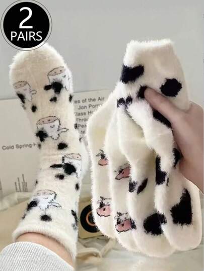 两双可爱奶牛图案毛绒圆领蓬松袜,加厚保暖珊瑚绒材质,蓬松柔软舒适,适合日常穿着、圣诞节、冬季居家保暖,温暖舒适 - 彩色 - 查看 16