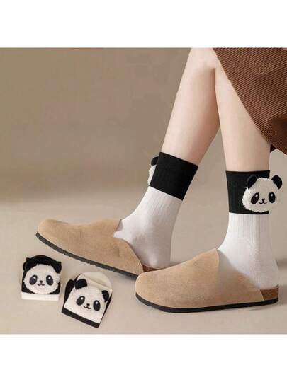 2 双白色可爱 3D 熊猫绒球中筒女士袜子柔软舒适醒目百搭个性休闲袜 - 白色 - 查看 3
