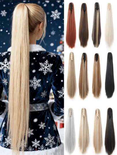 20英寸马尾接发爪长卷曲波浪直发夹式自然逼真合成接发马尾假发,适合女孩、女士圣诞节新年礼物(深棕色混合金色、白色和银色) - 彩色 - 查看 14