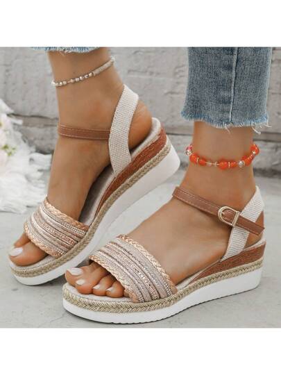 2025年夏季新款女士时尚户外沙滩度假风坡跟凉鞋,露趾百搭撞色凉鞋,搭扣绑带,厚底粗跟,女士派对高跟凉鞋