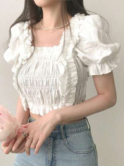 2025 夏季甜美荷叶边短款纯色休闲V领衬衫 - 白色 - 查看 1