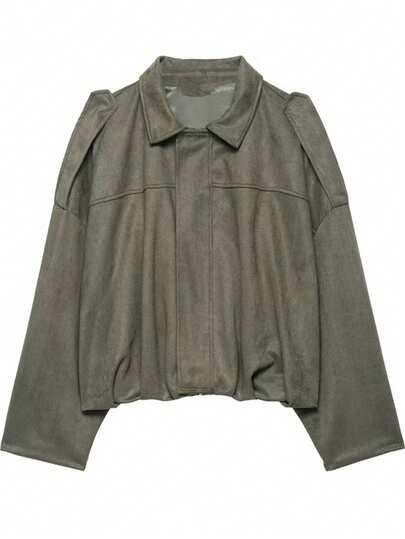 2025 女式纯色绒面纹理领飞行员夹克,休闲宽松长袖拉链外套 - 綠色 - 查看 2