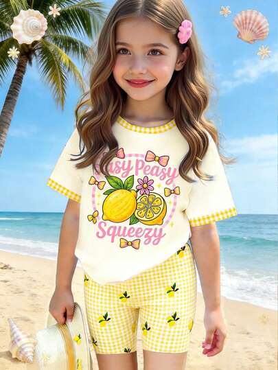 2026新款柠檬水果印花T恤和打底裤两件套,夏季女童时尚装扮,可爱舒适,时尚韩版夏季外出、度假、拍照必备