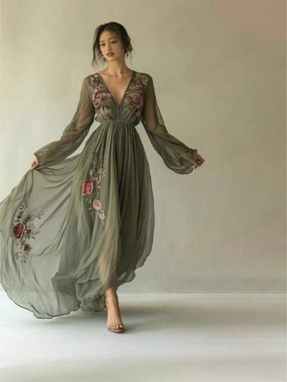 5. 2026 European And American New Women's Fashionable Casual Printed Long Sleeved Dress V-Neck Party Dress