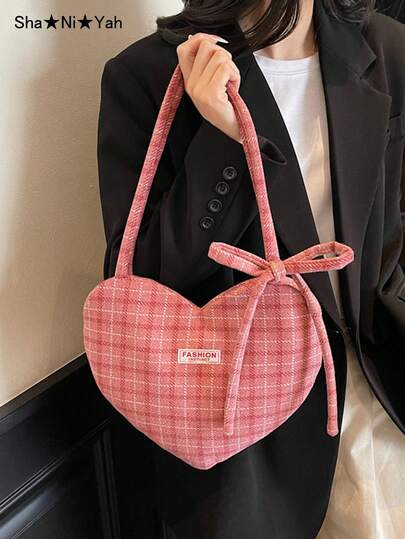 2026新款心形格纹单肩包,可爱百搭的腋下包,适合购物、聚会、旅行、通勤等场合,女士格纹布包 - 彩色 - 查看 2