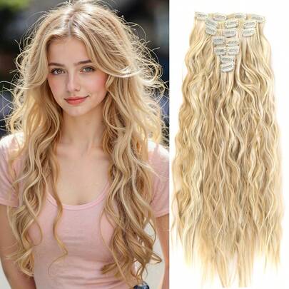 24英寸夹式接发套装,包含16片。无需胶水,内置夹子,佩戴方便快捷。长款波浪金色自然卷发。采用耐热合成纤维制成,适合女性、女孩、派对及日常使用。 - 金黃色16H613 - 查看 2