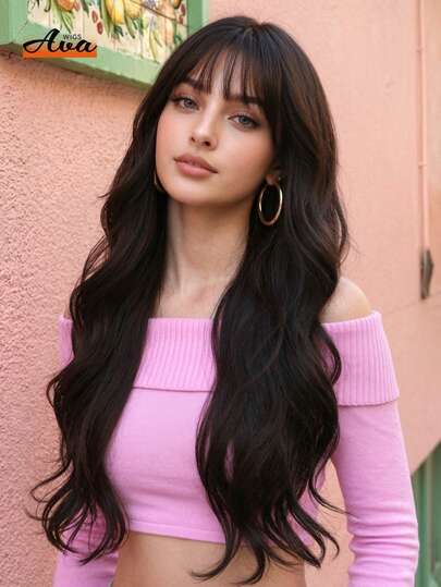 24英寸深棕色长波浪假发,带空气刘海,女士合成纤维假发,外观自然逼真,耐热纤维,适合日常佩戴和派对,高品质耐热纤维,深棕色经典长波浪剪裁,逼真发际线,舒适贴合刘海假发,长波浪合成纤维假发,外观自然,耐热假发,适合女性日常佩戴、派对、角色扮演,深棕色合成假发