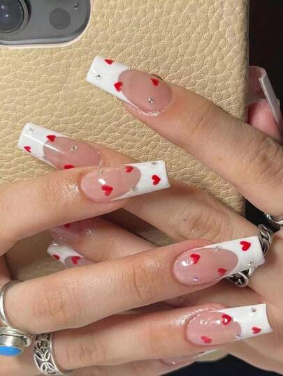 24粒假指甲片,中長款白色法式美甲片,帶有鑽石紅色愛心指甲+24粒果凍膠+摩擦條壓縮指甲,美甲用品 - 紅色 - 查看 1