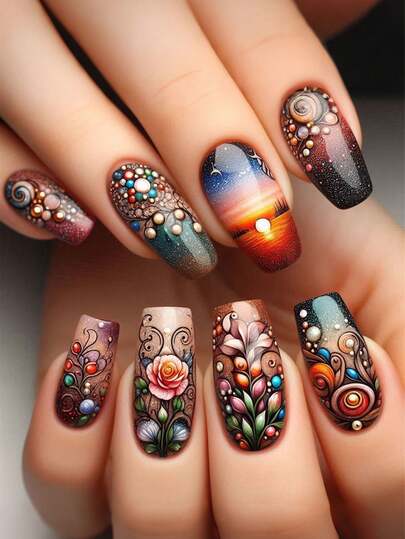 24片装深色按压式美甲,长棺材形,花朵图案,带胶水,日落图案亚克力美甲设计,全覆盖花朵太阳假指甲,粘贴式美甲,适合女性和女孩 - 彩色 - 查看 5