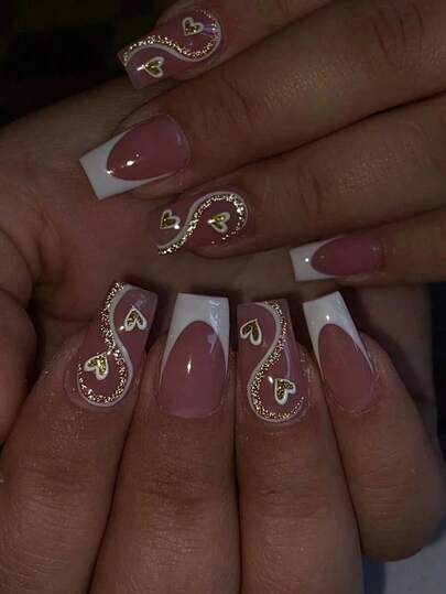 24Pcs Minimalist Cute Short Square Gold Heart Line Black French Minimalist Fashionable Nail Stickers, Wearable Nail Art Decal Stickers Suitable Daily, Date, Afternoon Tea, Outgoing Press On Nails Nail Supplies Nails