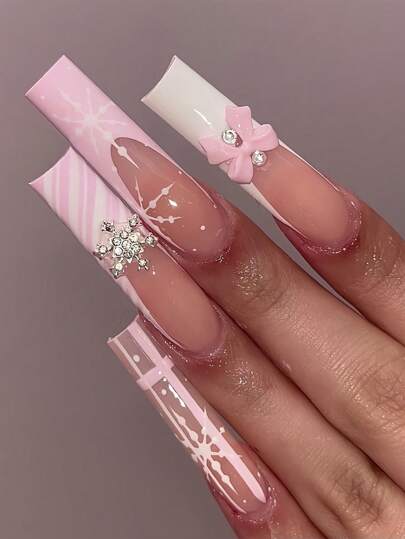 24 件圣诞美甲 - 白色雪花、蝴蝶结、水晶水钻假指甲、棺材形状、可爱粘贴指甲,配有果冻凝胶和指甲锉,适合女性日常佩戴和派对