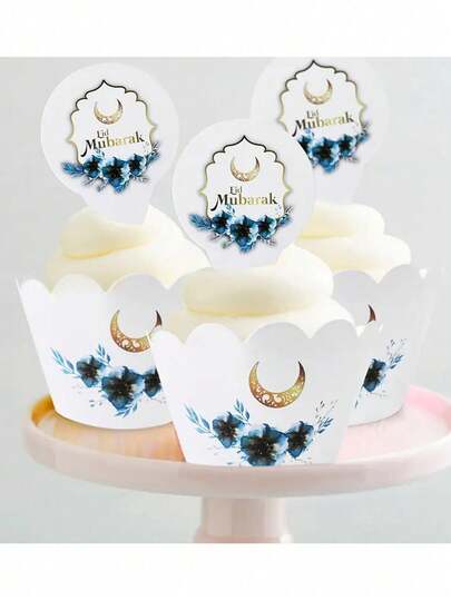 24个斋月主题纸杯蛋糕包装纸,适用于开斋节庆祝活动、生日派对、斋月蛋糕装饰、节日家庭聚会、桌面装饰、蛋糕装饰边框 - 彩色 - 查看 5
