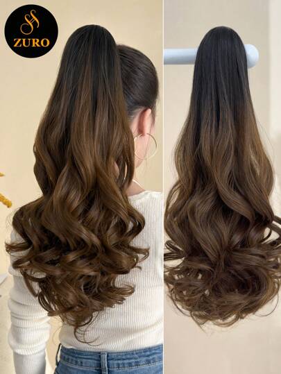 26-28英寸长波浪棕色合成纤维马尾假发,耐热纤维,爪夹设计,适合日常佩戴 - 漸層 - 查看 1