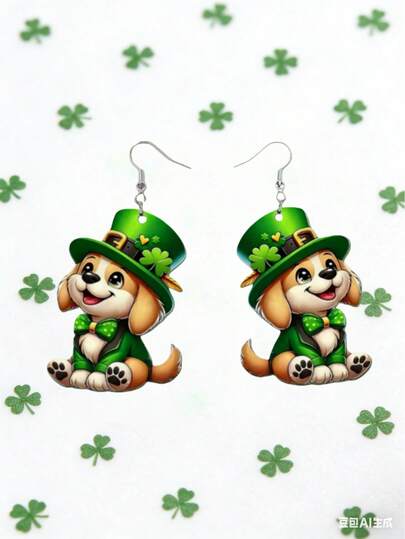 2D可爱小狗吊坠耳环,爱尔兰节日三叶草亚克力耳环,爱狗人士礼物,经典节日派对礼物,生日礼物,女友礼物