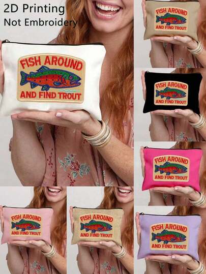 2D鱼群图案鳟鱼钓鱼化妆包,趣味钓鱼印花拉链化妆品收纳包,手提旅行洗漱包,可折叠轻便收纳袋,零钱包,拉链手拿包,化妆品收纳包