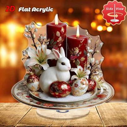 2D平面旋转亚克力桌面摆件 - 白兔手持红蜡烛和复活节彩蛋,复活节装饰,平面旋转展示架,适用于家居、节日派对 - A - 查看 1