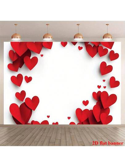 2D平面横幅,1张浪漫红色心形纸花背景,白色背景,散落着心形图案,适用于家居装饰、派对、工作室和户外庆典。