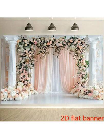 2D平面横幅,浪漫花卉婚礼背景,优雅的白色立柱和粉白相间的花朵,柔和的蜜桃色窗帘,涤纶材质,无需用电 - 1個 - 查看 1