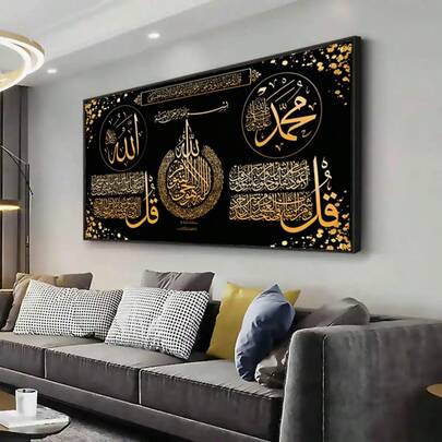 2D/平面大型装饰帆布墙画 - 金色阿拉伯书法抽象花卉设计,适用于客厅、卧室或走廊装饰,海报,优雅花卉设计,客厅艺术 | 优雅花卉设计 | 帆布,墙面装饰 50x150厘米 19.69x59.06英寸 无框 - 彩色 - 查看 4