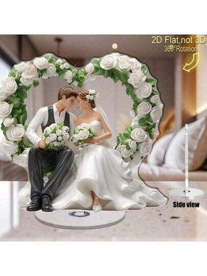 2D旋转新郎新娘婚礼雕像,心形花环 - 2D平面印刷亚克力情侣摆件,带旋转底座,户外婚礼蛋糕装饰,周年纪念礼物(浪漫收藏品),2D平面 - 彩色 - 查看 7