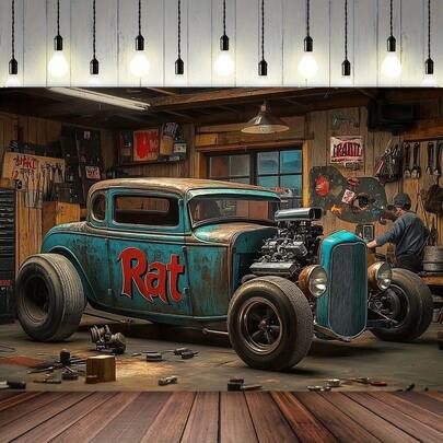 2D平面,1件装复古改装车库横幅 - 复古汽车和工具设计,无需电源,非常适合家居装饰、活动和派对,派对背景 | 经典汽车主题 - 1pcs - 查看 6