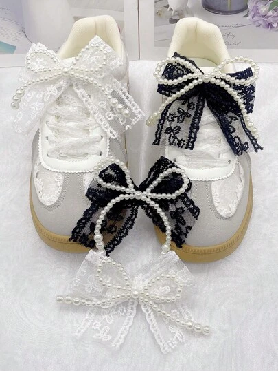 2件装黑白蕾丝人造珍珠蝴蝶结鞋饰 DIY饰品 适用于女士靴子运动鞋 可拆卸鞋带扣装饰 多功能鞋夹配件 适合女士系带鞋 圣诞节 万圣节 情人节 生日 节日派对礼物(不含鞋子)