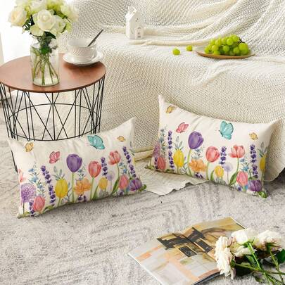 2件套春季花卉郁金香薰衣草桉树蝴蝶图案枕套,12 x 20英寸春季沙发靠垫套套装,单面图案,不含枕芯 - 彩色 - 查看 2