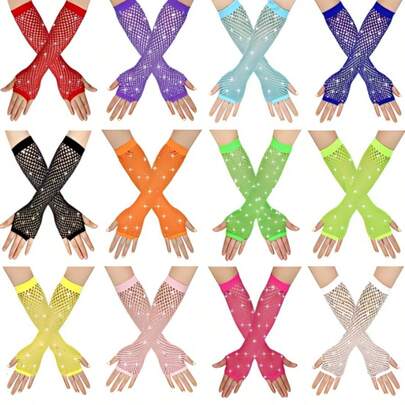 2只装女士80年代霓虹街头派对朋克风渔网镶钻高弹力露指手套,万圣节派对狂欢节母亲节礼物