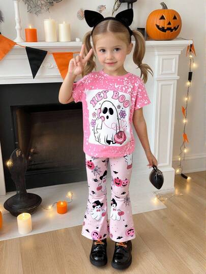 6. 2 件万圣节幼儿女童可爱怪异图形印花短袖 T 恤和卡通图案喇叭裤套装,活泼俏皮,适合日常穿着、万圣节派对、春夏季