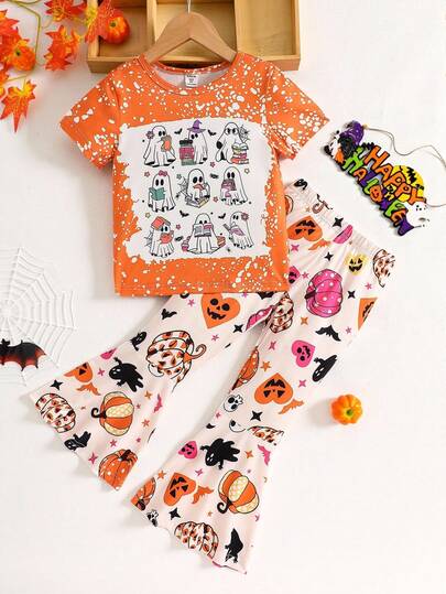 2 件套幼儿女孩可爱万圣节图案印花白色幽灵卡通短袖 T 恤和喇叭裤套装,俏皮可爱,适合春夏季节,适合万圣节、日常穿着、派对