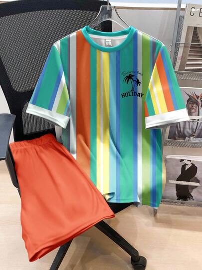 两件套男童休闲时尚经典度假条纹撞色拼接T恤短裤套装,标志性棕榈树剪影印花圆领短袖T恤,适合夏季穿着