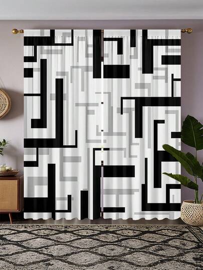 2 件抽象黑白几何方形数码印花窗帘,半透明窗帘,用于保护卧室和客厅的隐私 - 彩色 - 查看 1