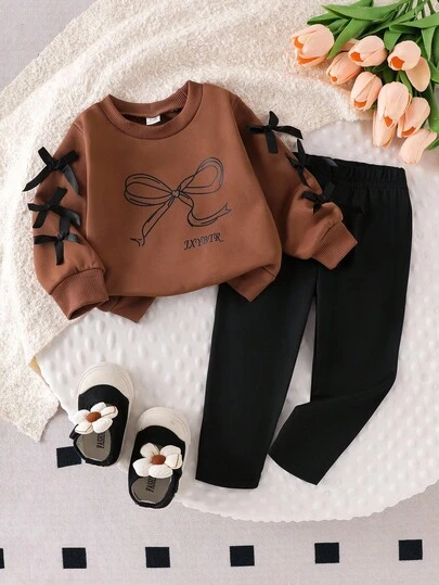 2 件套女婴休闲蝴蝶结印花长袖运动衫和针织打底裤套装,可爱又时尚,适合秋季 - 棕色 - 查看 5