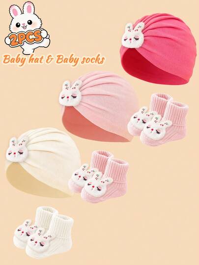 2件套婴儿柔软毛绒樱桃兔装饰针织印度帽+弹性脚套套装,柔软舒适,轻盈透气,可爱甜美,适合0-3个月新生儿,春夏外出及日常使用。 - 彩色 - 查看 2