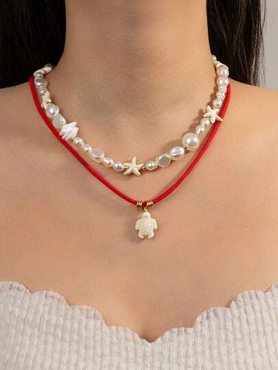 2件套波西米亚海滩风叠层海星和海龟吊坠项链,适合女性日常、通勤、度假和休闲穿着 - 彩色 - 查看 1