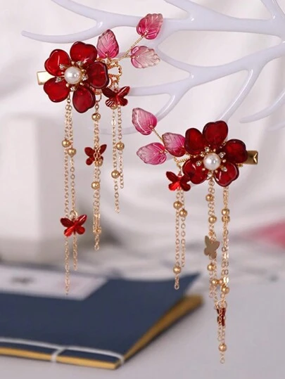 2 件中国风发夹,带有石榴、流苏和花朵设计,可爱甜美风格,是送给女性日常佩戴的完美礼物,优雅可爱,发饰,发夹,发夹,发夹 - 酒紅色 - 查看 2