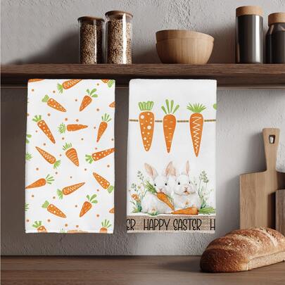 2条复活节可爱兔子胡萝卜图案厨房毛巾,柔软涤纶材质,适用于厨房装饰、清洁、节日派对装饰、厨房和浴室用品、家居装饰、乔迁礼物 - 彩色 - 查看 2