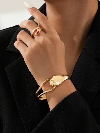 2件套时尚创意百搭加厚金属水滴蛇头手链戒指首饰套装,弹簧扣设计,适合日常搭配,嘻哈朋克街头风格,饰品 - 幾何套裝 - 查看 1