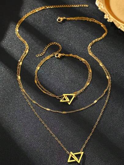 2 件几何三角形扣项链和手链首饰套装,适合女士,简约风格适合日常佩戴 - 三角形項鍊+手鍊 - 查看 1
