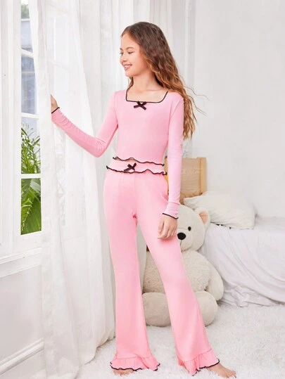 2 件套女孩可爱撞色蝴蝶结装饰修身上衣和喇叭裤睡衣套装 - 粉色 - 查看 1