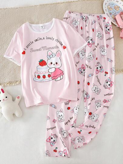 两件套女童兔子印花休闲圆领短袖上衣和全印花兔子裤子睡衣套装 - 淺粉色 - 查看 1