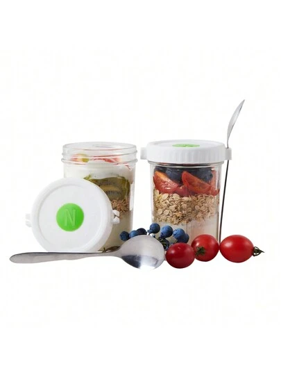2入組帶蓋&字母a-z設計的玻璃隔夜燕麥杯,包括2個杯子和2把湯匙,可重複使用不漏水的杯子,適用於隔夜燕麥,牛奶,酸奶,穀類和早餐,容量350毫升 - 彩色 - 查看 1