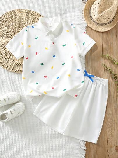 两件套儿童/青少年男童休闲皇冠印花针织Polo衫和白色弹力腰短裤套装,适合日常穿着、旅行、户外活动、假日派对、夏季海滩度假。