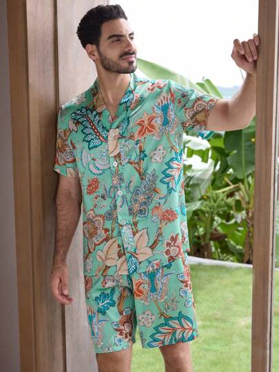 Manfinity ChillVibe 2 件套男士印花前扣短袖上衣和短裤睡衣套装 - 彩色 - 查看 1