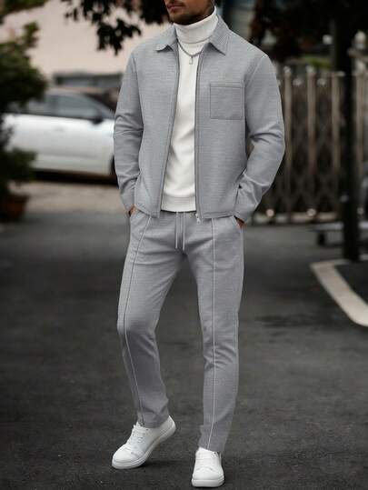 男士两件套,时尚简约拉链外套(带领子和口袋)+抽绳腰裤,轻盈涤纶面料,适合春秋季休闲、日常、度假穿着,也可作为送给男友的礼物。