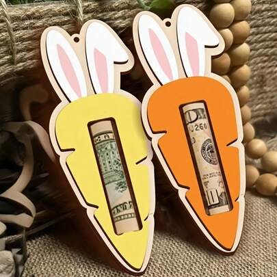 2件套,2D平面,木质复活节兔子胡萝卜钱夹,适合复活节装饰,复古人造吊牌,带兔子胡萝卜夹,可用于寻蛋游戏礼物、春季餐桌布置、用品,彩色兔子、胡萝卜和木质钱包装饰吊坠,节日礼物