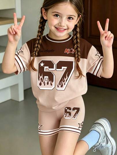 2件套,适合4-7岁女孩,休闲运动/街头风,67号洛杉矶火焰印花撞色圆领短袖T恤+骑行短裤,个性吸睛套装,适合日常穿着、上学、儿童节、春夏秋季。