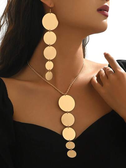 2件套秋冬新款创意Y形几何流苏吊坠项链套装,优雅百搭简约锁骨饰品 - 金黃色 - 查看 1