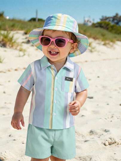 2件套男婴夏季休闲韩版可爱条纹拼接短袖上衣和松紧腰短裤套装,适合夏季穿着 - 綠色 - 查看 2