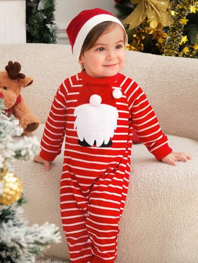 SHEIN 2 件套男婴休闲圣诞圣诞老人刺绣绒球连体衣带帽子,适合圣诞节、秋冬季 - 紅色 - 查看 1